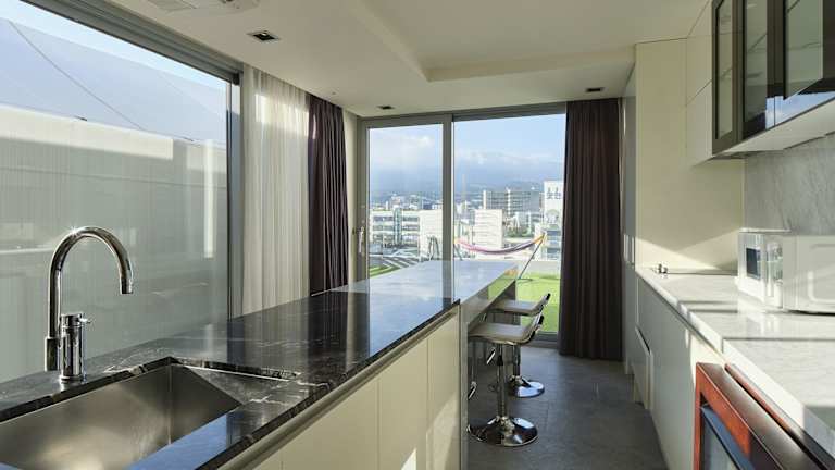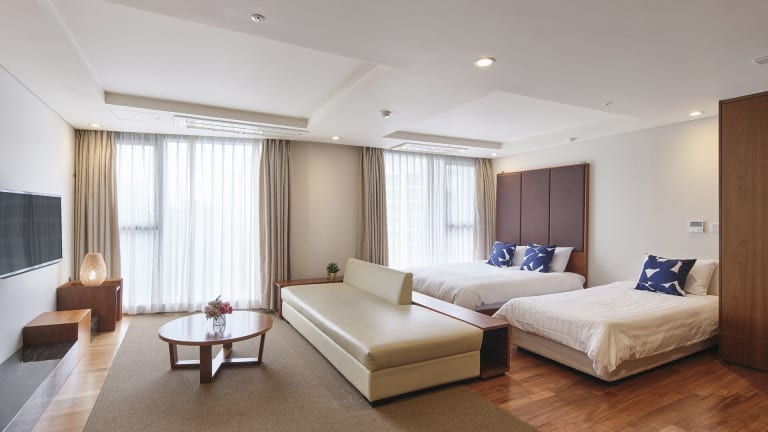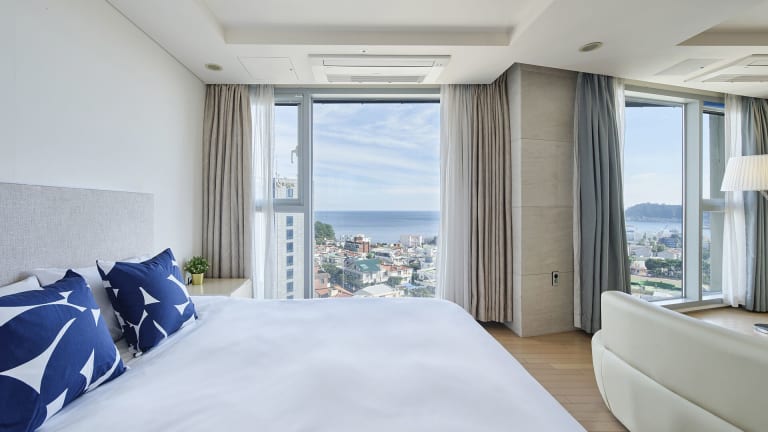 Die klimatisierten Zimmer sind mit einem Flachbild-TV, einem Kühlschrank und einem Sitzbereich mit einem Sofa ausgestattet. Eine Dusche, kostenfreie Pflegeprodukte, Bademäntel und ein Haartrockner sind im eigenen Badezimmer vorhanden. Viele Zimmer bieten zudem einen schönen Blick auf das Meer oder den Berg Halla. Die Unterbringung umfasst Familien- und Nichtraucherzimmer.