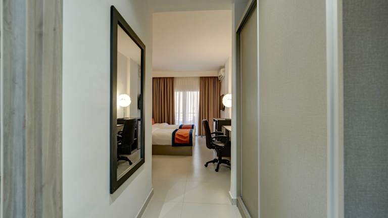 Die klimatisierten Zimmer sind mit einem Doppelbett oder Kingsize-Bett, Safe, Minibar, Kühlschrank und Tee-/Kaffeezubereiter ausgestattet. Zusätzlich sind ein Schreibtisch, TV mit Satelliten-/Kabelempfang, Radio, Haartrockner, Bademäntel und Kosmetikartikel vorhanden. Das Badezimmer verfügt über Dusche und Badewanne, und die Gäste erhalten Bettwäsche sowie Handtücher.