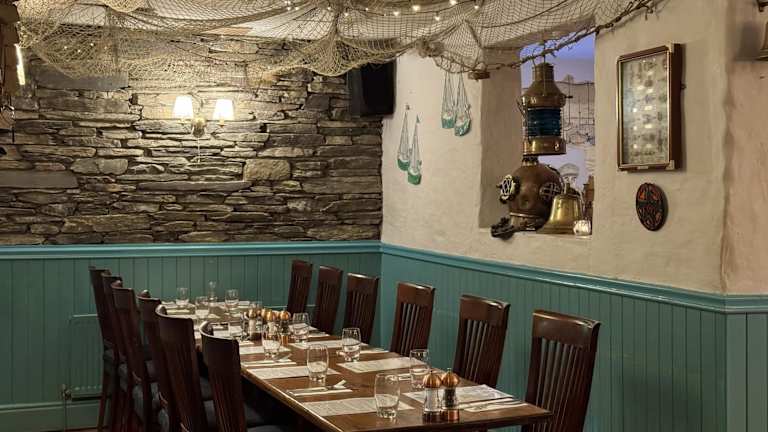 Im Moorings Restaurant können Sie frisch gefangenen Fisch aus dem Hafen von Portmagee genießen. Das Restaurant bietet auch besondere Abende mit delikatem irischem Rindfleisch und Gemüse aus der Region. In der Bridge Bar können Sie bei preisgekrönten Speisen traditioneller irischer Musik lauschen und sogar tanzen.