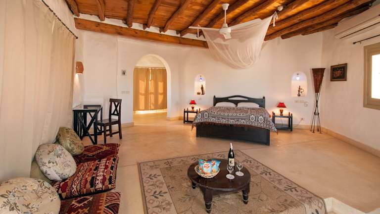 Die 49 geräumigen und individuell gestalteten Chalets sind unter Verwendung von natürlichen Baumaterialien im Nubischen Stil mit viel Liebe zum Detail gebaut worden. Jedes dieser Chalets ist ein Unikat: individuelle Grundrisse, unterschiedliche Stilelemente und Farben prägen die sehr geschmackvoll eingerichteten Zimmer. Außerdem erlaubt die Terrasse von jedem Chalet aus einen uneingeschränkten und atemberaubenden Blick auf das Meer! Alle Chalets verfügen über einen Hauptraum, ein großzügiges Badezimmer mit Dusche und WC, solarenergiegeheiztes Wasser und mehrere 220 Volt-Steckdosen. Die natürliche Kühlung ist durch die Bauweise im Nubischen Stil gewährleistet. Für zusätzlichen Komfort sorgen Deckenventilatoren und Klimaanlagen, die die wärmeren Nächte angenehmer gestalten. Alle Chalets verfügen zusätzlich über eine Minibar. Die Zimmer sind mit Einzel- oder Doppelbetten (bzw. zwei separaten Einzelbetten "twin") ausgestattet.