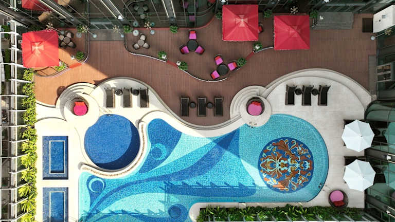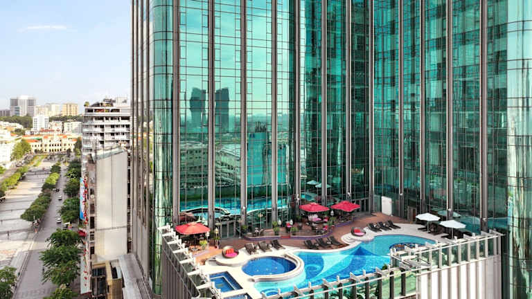 Die gastronomischen Einrichtungen umfassen drei Restaurants, die auf unterschiedliche Küchen spezialisiert sind, darunter kantonesische und französische Küche. Zudem gibt es eine Bar, das The Long @, die im Stil einer High Street gestaltet ist, wo Gäste ihren Abend ausklingen lassen können.