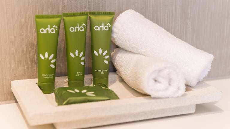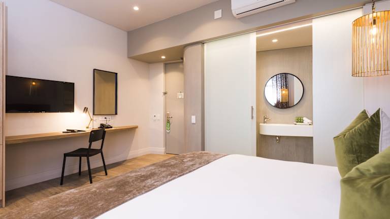 Die Zimmer sind modern gestaltet und verfügen über eine Klimaanlage, kostenloses WLAN, einen Safe, eine Kochnische sowie Tee- und Kaffeezubereitungsmöglichkeiten. Die Doppelzimmer und Luxus-Studios sind jeweils mit einem kombinierten Wohn-/Schlafzimmer ausgestattet. Auch Badezimmer mit Dusche und Föhn sind vorhanden. Die Zimmer bieten unterschiedliche Ausblicke und haben eine Fläche von ca. 26 m².