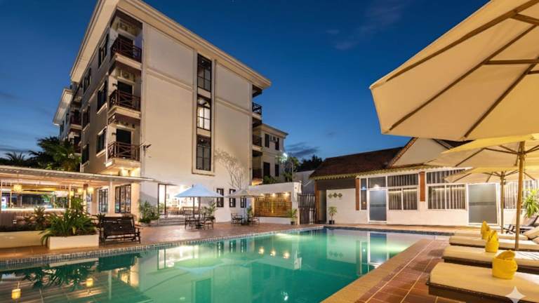 Das Hotel The Sanctuary Residence in Siem Reap bietet eine ideale Lage im Geschäftsviertel und ist nur eine kurze Fahrt von Angkor Wat und der National Road 6 entfernt. Genießen Sie den Komfort und die Annehmlichkeiten dieses Hotels, darunter ein Außenpool, ein Fitnessstudio und kostenloses WLAN. Das Hotel bietet auch einen kostenlosen Flughafentransfer und ein kostenloses englisches Frühstück.
