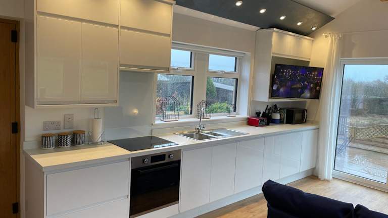 Das Ferienhaus hat ein Schlafzimmer und ist ausgestattet mit Kabel-Flachbild-TV, einem Essbereich, einer Küchenzeile mit Kühlschrank und einem Wohnzimmer. Handtücher und Bettwäsche werden bereitgestellt.