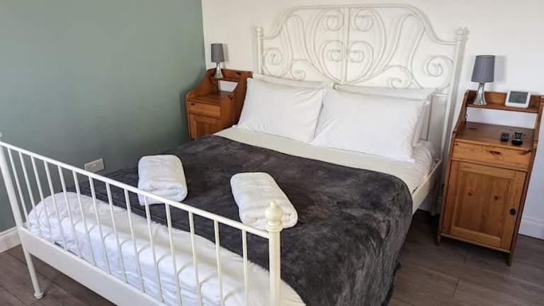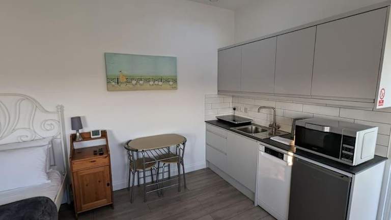 Die Ferienwohnung bietet ein Schlafzimmer sowie eine Küchenzeile. Handtücher und Bettwäsche werden bereitgestellt.