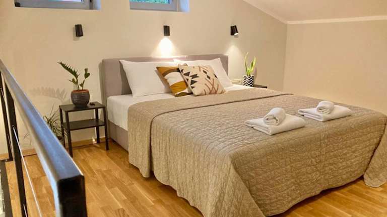 Das klimatisierte Apartment verfügt über 2 separate Schlafzimmer, ein gemütliches Wohnzimmer, eine voll ausgestattete Küche und ein modernes Badezimmer. Die Zimmer sind komfortabel eingerichtet und bieten Platz für eine angenehme Nachtruhe. Ein Flachbild-TV steht für Unterhaltung zur Verfügung und das kostenfreie WLAN ermöglicht es Ihnen, mit Freunden und Familie in Verbindung zu bleiben. Auf dem Balkon können Sie die frische Luft genießen und die Terrasse bietet einen perfekten Ort zum Entspannen. Kostenlose Privatparkplätze stehen ebenfalls zur Verfügung.