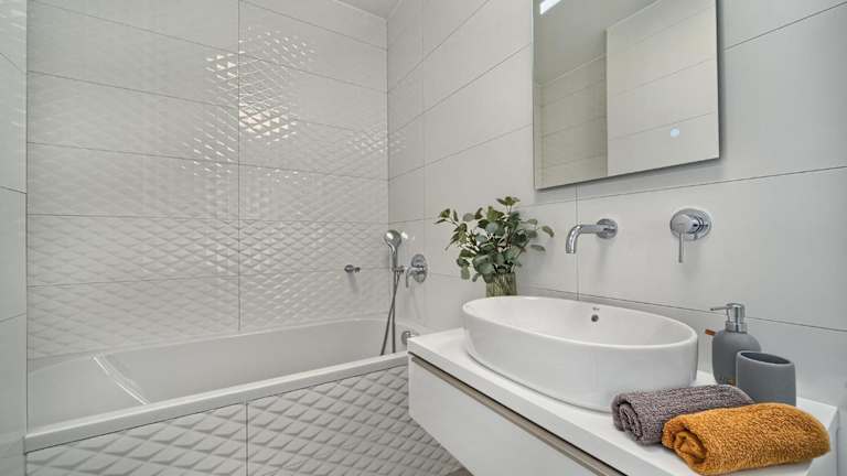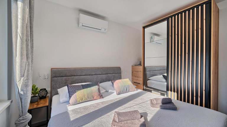 Die Ferienwohnung verfügt über zwei Schlafzimmer, ein Wohnzimmer, eine voll ausgestattete Küche mit Kühlschrank und Kaffeemaschine sowie zwei Badezimmer mit Dusche und Haartrockner. Jedes Zimmer ist mit Klimaanlage ausgestattet und es gibt einen Flachbild-TV. Ein Balkon gehört ebenfalls zur Ausstattung.