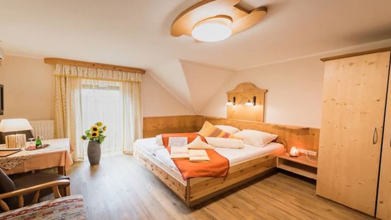Alle unsere Zimmer sind Bio-Gesundheitszimmer mit Zirben-Vollholzbetten, ausschließlich Nichtraucher-Zimmer. Nachweislich wird die Schlaf- und Erholungsqualität verbessert. Dem Herzen werden 3500 Schläge pro Tag (ca. 1 Stunde Herzarbeit) erspart. Der Schlaf ist vor allem im ersten Schlafzyklus tiefer und die vegetative Erholung des Körpers ist um vieles besser! • Anti-Allergie-Ausstattung (deshalb keine Haustiere!) • Salzkristall-Leuchten für Wohlfühl-Ambiente • Entspannungs-Kräuterkissen • Belebtes Grander-Wasser im ganzen Haus • Balkon oder Sonnenterrasse • Telefon, Safe, Sat- und Sky-TV, Radio • Gratis Internetanschluss in allen Zimmern • Die meisten Zimmer und die Ferienwohnungen sind voll klimatisiert • Wärmeschutz-Rollos mit Insektengitter • Am Zimmer erwartet Sie eine kleine Kostbarkeit aus der Region