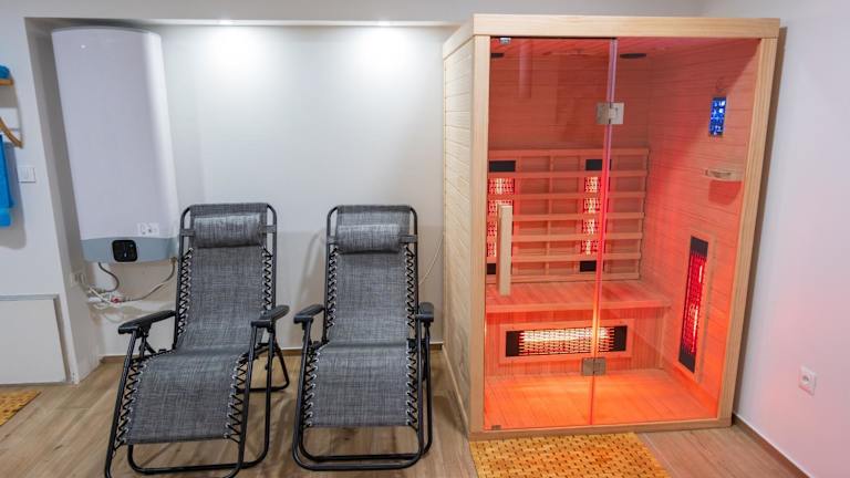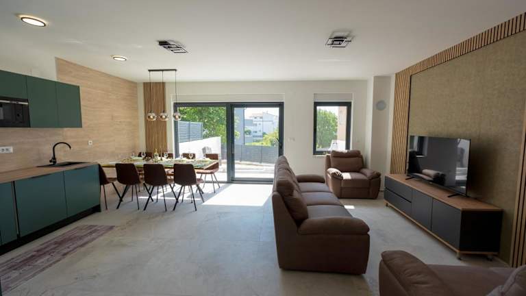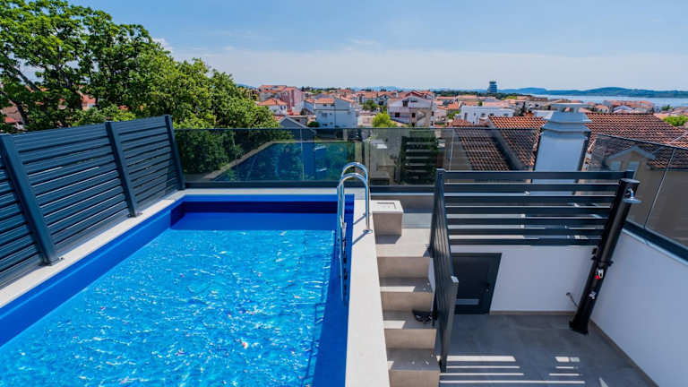 Three-Bedroom Premium Holiday Home Atmosfera with Private Pool&Sauna ist eine Unterkunft, die durch einen saisonalen Außenpool sowie eine Sauna besticht. Es handelt sich um ein Nichtraucherhaus, das über einen kostenfreien Privatparkplatz verfügt. Die Check-in-Zeiten sind zwischen 15:00 und 22:00 Uhr, und der Check-out ist zwischen 08:00 und 10:00 Uhr möglich. Die Unterkunft hat eine Terrasse mit Stadtblick.