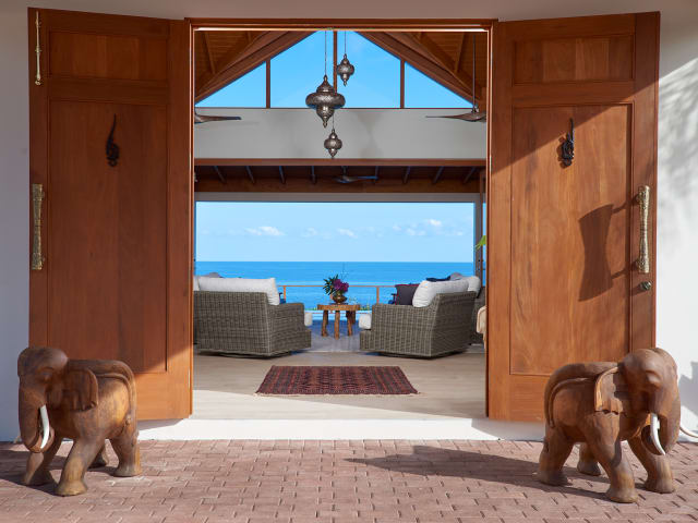 Timbuktu by the Sea ist eine luxuriöse Ferienvilla in Boscobel, Jamaika. Erleben Sie Spuren von Timbuktu, dem Nahen Osten und Asien inmitten einer wunderschönen tropischen Umgebung direkt am Karibischen Meer. Jeder Raum des Hauses ist vom Meer umrahmt, inspiriert von den Werken des srilankischen Architekten Geoffrey Bawa. Die atemberaubende Aussicht, die sich Ihnen bietet, wenn Sie durch die massiven geschnitzten Dogon-Türen treten, wird Sie dazu bringen, alle Sorgen in den Wind zu schlagen! Ihr persönlicher Butler lädt Sie ein, Ihr Gepäck abzugeben, sich in einem bequemen Sessel niederzulassen und die Umgebung mit einem jamaikanischen Cocktail zu genießen. Es ist Zeit für Verwöhnung. Timbuktu by the Sea bietet eine luxuriöse Ausstattung, von den wunderschön geschnitzten Schlafzimmermöbeln bis hin zur prächtigen weißen Premium-Bettwäsche. Annehmlichkeiten im Überfluss. Auf drei Ebenen können Sie sich entspannen: im Infinity-Pool, im romantischen Shiva-Overlook und auf dem Steg am Meer, von dem aus Sie direkt ins Riff schauen können. Die Gäste können den Pickleballplatz und das Fitnessstudio nutzen, Tischtennis, Badminton oder Fußball spielen. Ein Schildkrötenschutzgebiet ist nur wenige Minuten entfernt (Sie können die Schildkröten auch von Ihrem Zimmer aus im Meer beobachten). Spa-Dienstleistungen und Massagen werden direkt auf Ihr Zimmer geliefert. Golf und Tennis sind in der Nähe und können arrangiert werden. Wer Ruhe braucht, kann sich in der Bibliothek oder bei einem Filmabend im Fernsehraum entspannen. Den Sonnenuntergang an der Feuerstelle oder an der Bar zu beobachten, ist ein wahrer Publikumsliebling. Diese Villa hat etwas für jeden, von Familien, Rentner, Freunde, die einen Ort brauchen, um sich für besondere Anlässe zu treffen. Das Personal garantiert Ihnen einen unvergesslichen Urlaub.
