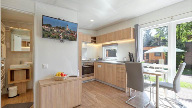 Das Ferienhaus verfügt über ein Schlafzimmer sowie ein Wohnzimmer mit einem TV. Außerdem ist eine voll ausgestattete Küche mit einem Kühlschrank vorhanden.