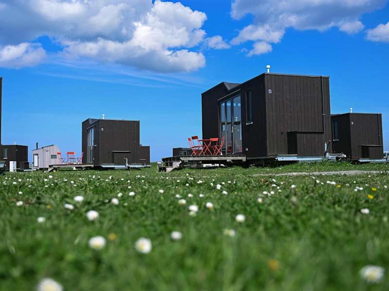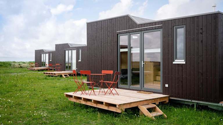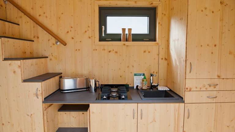 Tiny House Nature 1 Innenlage - Green Tiny Village Harlesiel bietet Übernachtungsmöglichkeiten in einem modernen Tiny House. Es handelt sich um ein Nichtraucherhaus mit einer ruhigen Atmosphäre, ideal für entspannende Aufenthalte.