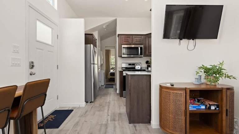 Das Ferienhaus verfügt über ein separates Schlafzimmer, eine voll ausgestattete Küche mit einem Kühlschrank und einem Ofen sowie ein Badezimmer. Handtücher und Bettwäsche werden bereitgestellt.