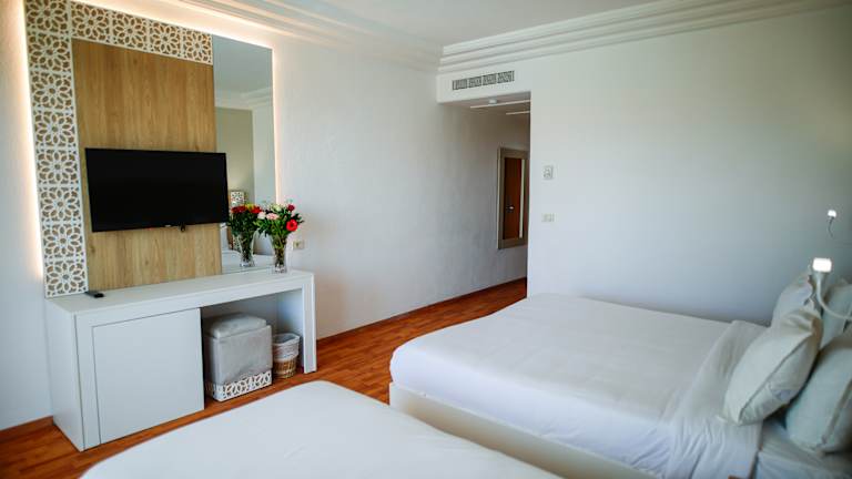 Das TMK L'Atrium Yasmine Hammamet **** ist ein Komplex mit 225 Zimmern, die sich auf 4 Etagen verteilen. Es wurde 2024 renoviert, um ein modernes und einladendes Hotel zu werden, das von Gärten und Palmenhainen umgeben und nur 25 Meter vom Mittelmeer entfernt ist. Die geräumigen und komfortablen Zimmer mit Balkon oder Terrasse sind mit viel Geschmack und Liebe zum Detail gestaltet und eingerichtet. Kostenloser Wi-Fi-Anschluss, TV, Klimaanlage, Telefon, Minikühlschrank, Doppelbett (zusammen) oder zwei Einzelbetten, Balkon oder Terrasse, kostenloser Safe, komplettes Badezimmer mit Dusche, Toilettenartikeln, Haartrockner, Reinigungsservice 6 Tage pro Woche, Handtuchwechsel 4 Tage pro Woche und Wechsel der Bettwäsche 3 Tage pro Woche. Die Anlage verfügt über ein beheiztes Innenschwimmbad und ein großes Außenschwimmbad, in dem Sie ein erfrischendes Bad nehmen und sich unter der tunesischen Sonne inmitten einer üppigen grünen Vegetation entspannen können. Nur 25 m vom Hotel entfernt befindet sich ein PRIVATER STRAND, wo Sie ein erfrischendes Bad im Mittelmeer genießen können. Unser Ziel ist es, dass Sie während Ihres Urlaubs die nötige Entspannung finden, aber dank unseres exklusiven Tag- und Nacht-Animationsprogramms auch die beste Unterhaltung haben. Im"Ibiza Beach Club" finden Sie die schönsten Sonnenuntergänge in einer einzigartigen Umgebung, in der die gute Atmosphäre und die beste Musik Ihre Nachmittage und Abende zu unvergesslichen Erlebnissen machen werden. Wenn Sie einen gesunden Lebensstil pflegen, haben wir einen multifunktionalen Sportbereich unter freiem Himmel, wo Sie sich sportlich betätigen können und Ihren Geist ebenso fit halten können wie Ihren Körper. Mit unserem Team von Sportlehrern können Sie eine breite Palette von geführten Gruppensportaktivitäten genießen. Das Hotel verfügt über einen einzigartigen Raum, in dem Sie Ihren Alltagsstress abladen und neue Energie tanken können.