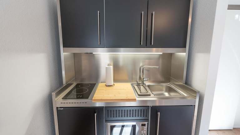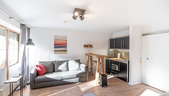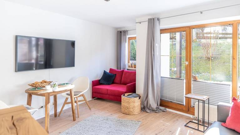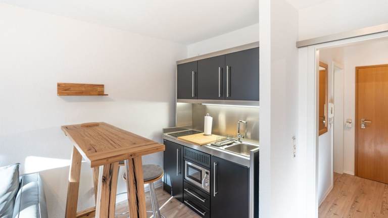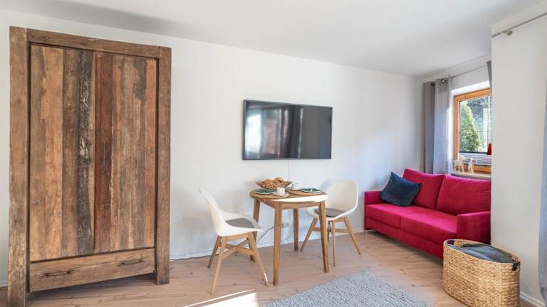 Die Ferienwohnung verfügt über ein Wohnzimmer sowie eine voll ausgestattete Küche mit Kühlschrank und Mikrowelle. Ein TV ist ebenfalls vorhanden.