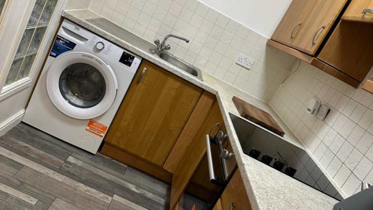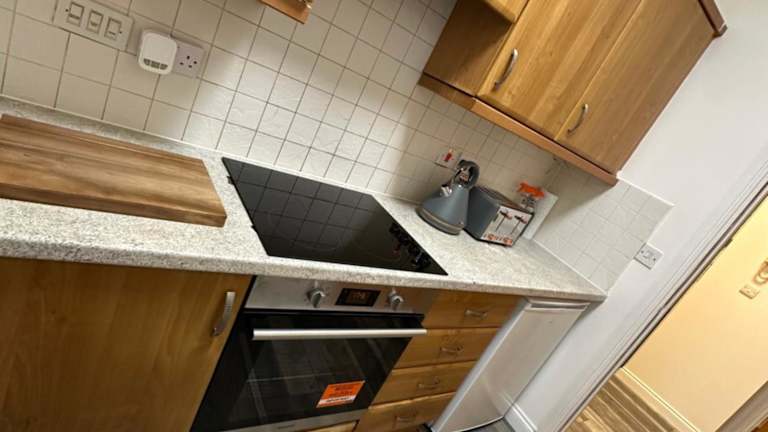 Die Ferienwohnung umfasst ein Schlafzimmer, ein Wohnzimmer und eine Küche, die vollständig ausgestattet ist.