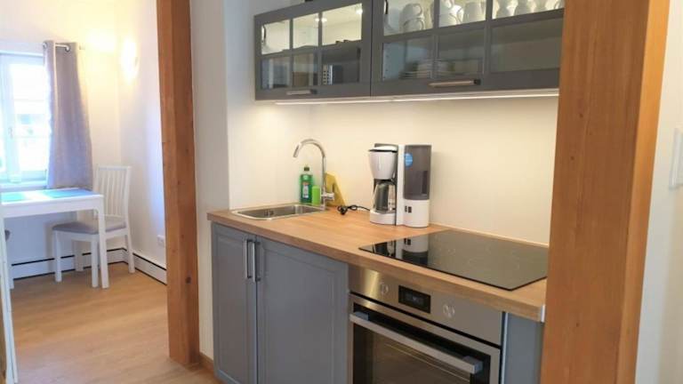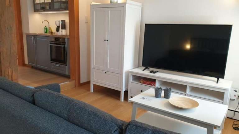 Torhaus Rattelsdorf - Wohnung 2 Edelweiß bietet ein Wohnzimmer mit Flachbild-TV und eine moderne Küchenzeile. Die Unterkunft hat eine Nichtraucherpolitik in allen öffentlichen und privaten Bereichen. Die Übernachtung im Torhaus erfordert eine Vorauszahlung per Überweisung.