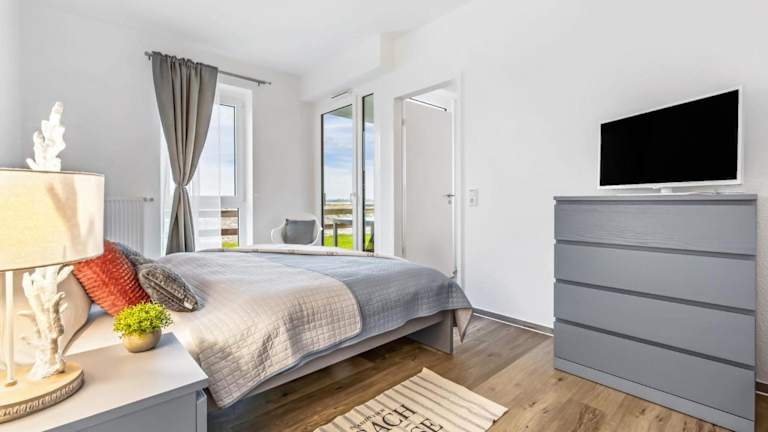 Die Ferienwohnung umfasst zwei Schlafzimmer, eine gut ausgestattete Küche mit Kühlschrank und Geschirrspüler sowie ein Wohnzimmer.