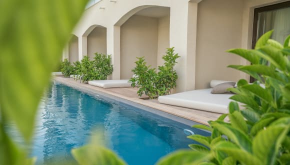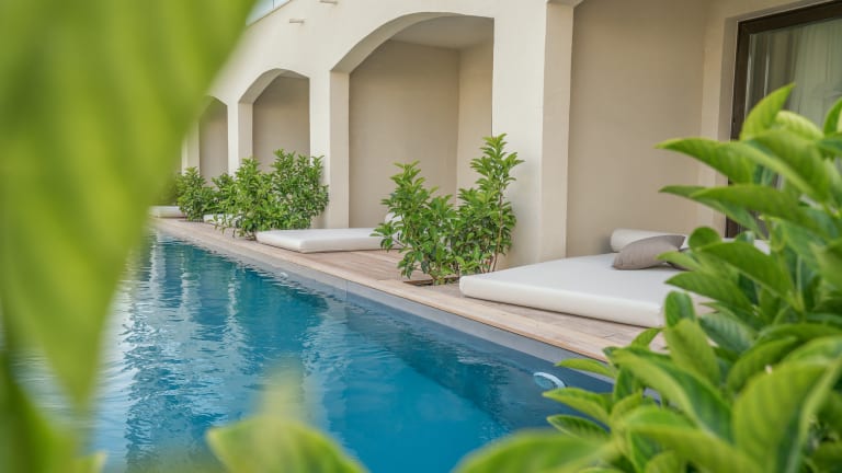 Das Hotel verfügt über insgesamt 238 modern eingerichtete Zimmer. Die Doppelzimmer Deluxe Gartenseite bieten einen Balkon oder eine Terrasse und sind mit Annehmlichkeiten wie einem Flachbildfernseher, einem Safe und kostenlosem WLAN ausgestattet. Die Doppelzimmer Typ A verfügen über eine Terrasse mit Sonnenliegen und privatem Pool.