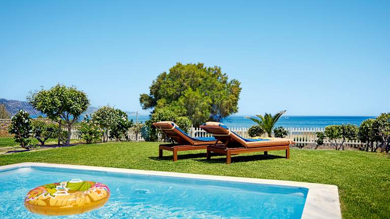 Im Ort Amoudara, ca. 20 km vom Flughafen Heraklion entfernt und in direkter Strandlage im Norden Kretas. Heraklion ist gut mit dem Bus zu erreichen.