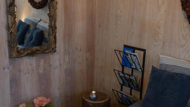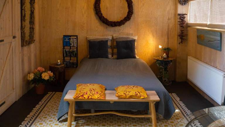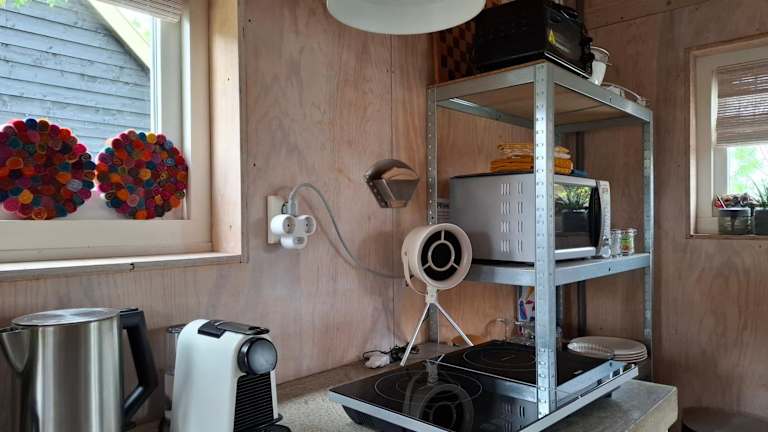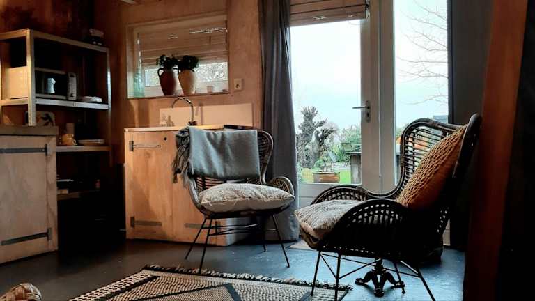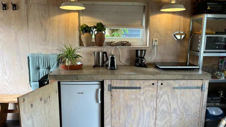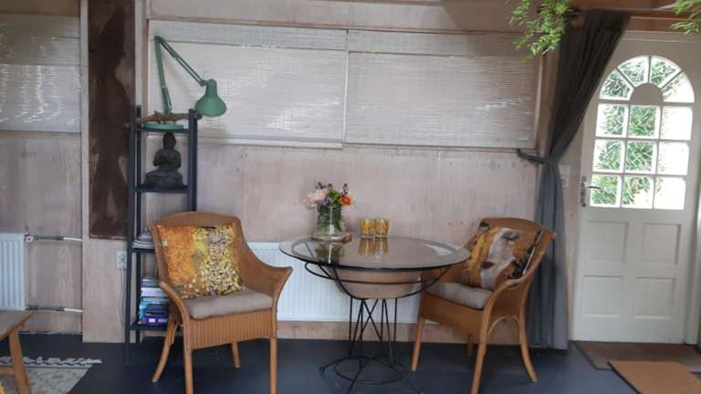Tuinhuis verfügt über ein Schlafzimmer und ein Badezimmer mit einer Dusche. Zudem gibt es einen Sitzbereich und eine Küche, die mit einem Kühlschrank ausgestattet ist. Handtücher und Bettwäsche werden bereitgestellt.