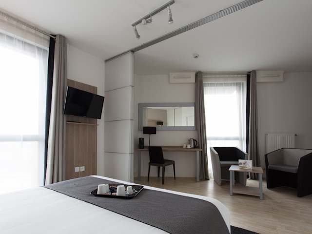 Die 36 Nichtraucherzimmer des Hotels erstrecken sich über 6 Stockwerke und bieten den Gästen Komfort und Gemütlichkeit. Jedes Zimmer verfügt über ein Doppelbett, einen Safe und einen Schreibtisch. In der Kochnische finden Sie einen Kühlschrank und eine Mikrowelle. Zur weiteren Ausstattung gehören ein Telefon, ein Flachbildfernseher und WLAN. Im Badezimmer gibt es eine Dusche, einen Haartrockner und kostenlose Kosmetikartikel. Für Familien mit Kindern stehen auch Familienzimmer zur Verfügung.