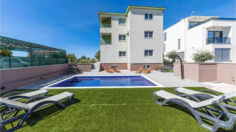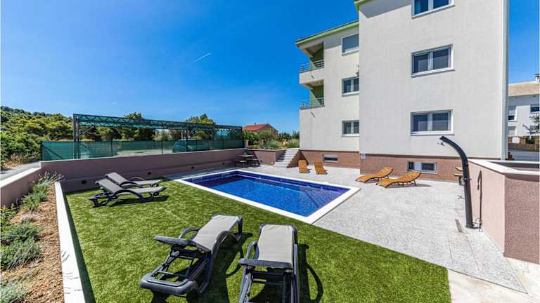 Das Two-Bedroom Apartment Saldun With Sea View 08 bietet eine Ferienwohnung mit Meerblick und umfasst eine Klimaanlage. Zur Anlage gehört ein Außenpool. Die Unterkunft ist als Nichtraucherunterkunft konzipiert und bietet kostenlosen Privatparkplatz sowie kostenfreies WLAN in den gesamten Bereichen.