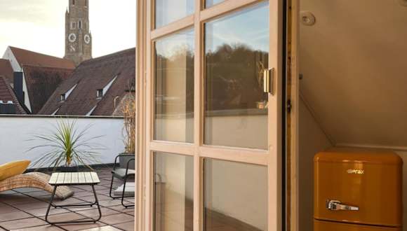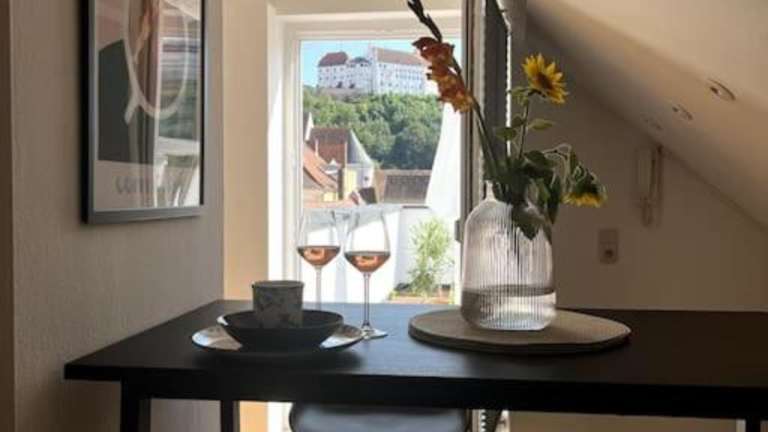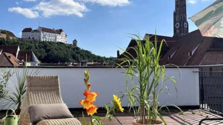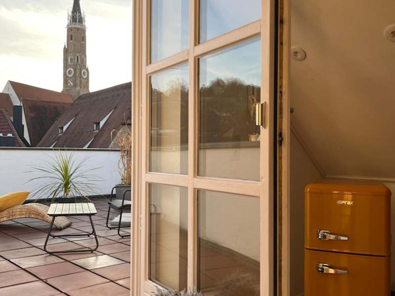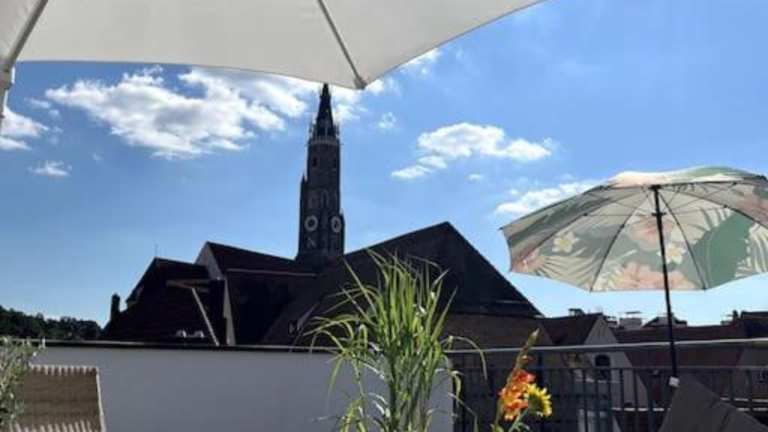 Über den Dächern der Landshuter Altstadt bietet Übernachtungsmöglichkeiten mit einer Terrasse und einem Balkon. Diese Ferienwohnung ist modern und komfortabel gestaltet.