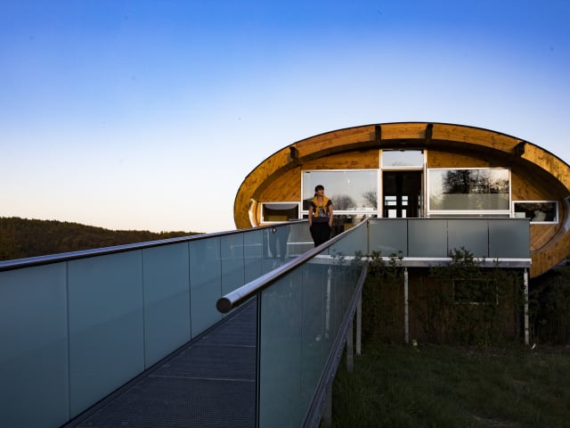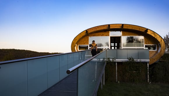 Urlaub dem Himmel so nah! Nach den Sternen greifen und die Seele fliegen lassen. Im ganz besonderen Holzhaus, kuschelig ausgebaut in seiner runden Form mit heimischen Naturmaterialien für gesundes Wohlfühlen und nachhaltig umweltfreundliches Wohnen. Drei Balkone und viel Glas versprechen Sonne oder Schatten und Nähe zur umgebenden Natur zu jeder Tageszeit. Eigene Infrarotliege im großzügigen Wellness-Bad. Der Schwimmteich lockt im Sommer mit seinem kühlen Nass und rund um Jahr als Biotop zum entspannten Beobachten von wichtigen und seltenen Insekten. Fränkisch-regionale Schlemmerkorbfüllung zur Begrüßung inklusive, Brötchenservice auf Wunsch täglich.
