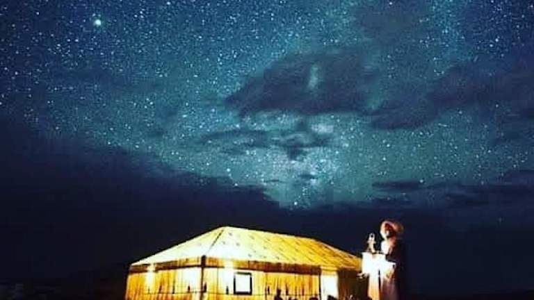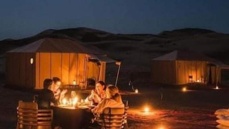 Das Desert Nights Camp in Merzouga bietet luxuriöse Unterkünfte inmitten der Wüste. Genießen Sie den Komfort kostenfreier Privatparkplätze und ein köstliches Frühstück mit vegetarischen, veganen oder Halal-Optionen. Entspannen Sie auf der Terrasse des luxuriösen Zeltes und lassen Sie sich vom kostenlosen Flughafentransfer verwöhnen.