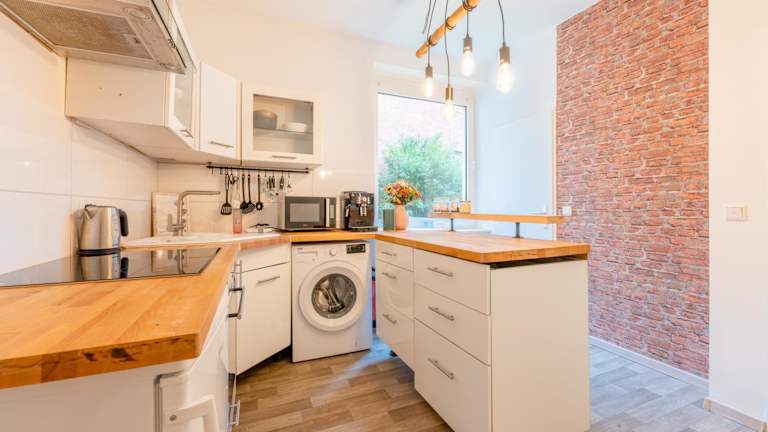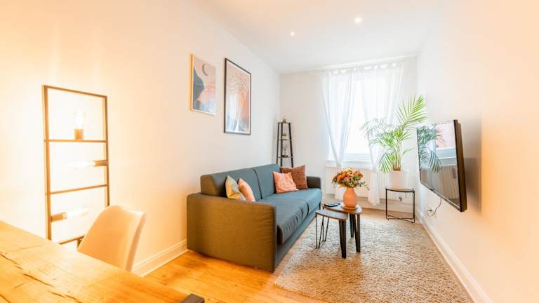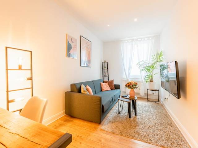 Die Ferienwohnung verfügt über ein Schlafzimmer, ein Wohnzimmer, einen Flachbild-TV, eine gut ausgestattete Küche mit Kühlschrank und Ofen sowie ein Badezimmer mit Dusche. Handtücher und Bettwäsche werden bereitgestellt.