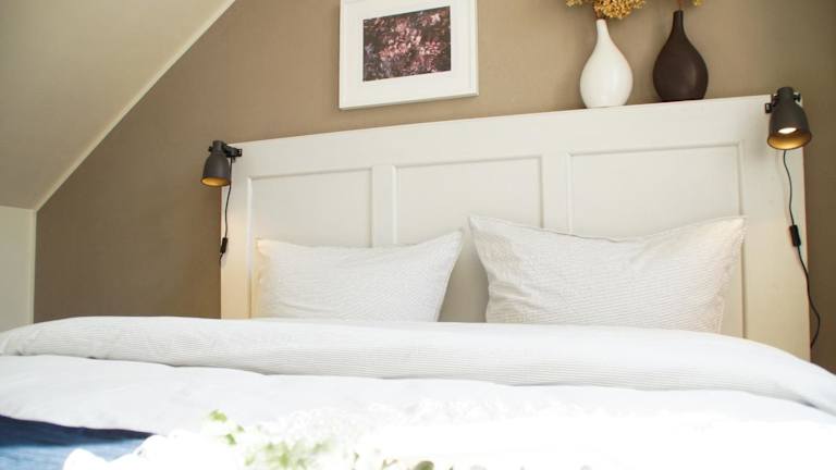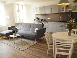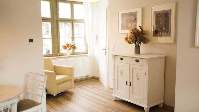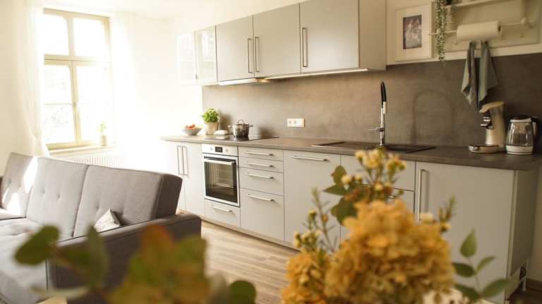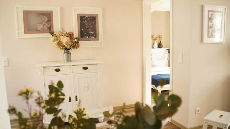 Das Apartment im Urlaubsfreude Biedermann Haus Blumenglück - Hortensie verfügt über ein gemütliches Schlafzimmer, ein geräumiges Wohnzimmer und eine voll ausgestattete Küchenzeile mit Kühlschrank und Kaffeemaschine. Das Badezimmer ist mit einer Dusche ausgestattet und Handtücher und Bettwäsche werden gestellt.