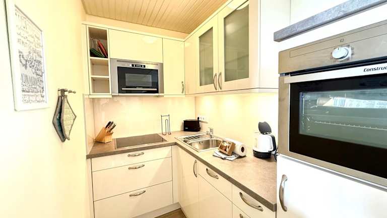 Die Unterkunft verfügt über eine Küchenzeile, die mit einem Kühlschrank, einem Geschirrspüler, einem Ofen, einer Kaffeemaschine und einem Wasserkocher ausgestattet ist, was die Zubereitung eigener Mahlzeiten ermöglicht.