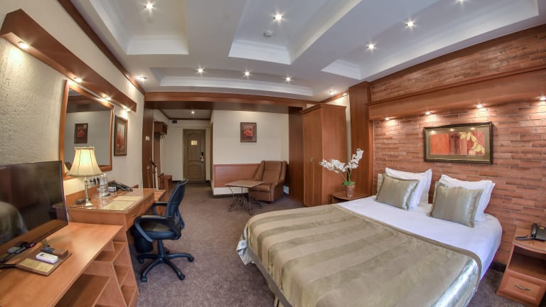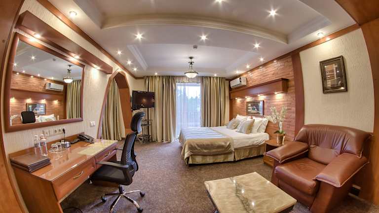 Die 100 Zimmer des Uyut Almaty Hotels sind klassisch eingerichtet und klimatisiert. Jedes Zimmer verfügt über einen Flachbild-TV, eine Minibar und ein eigenes Badezimmer mit Hausschuhen und Bademänteln. Kostenloses WLAN ist ebenfalls verfügbar.