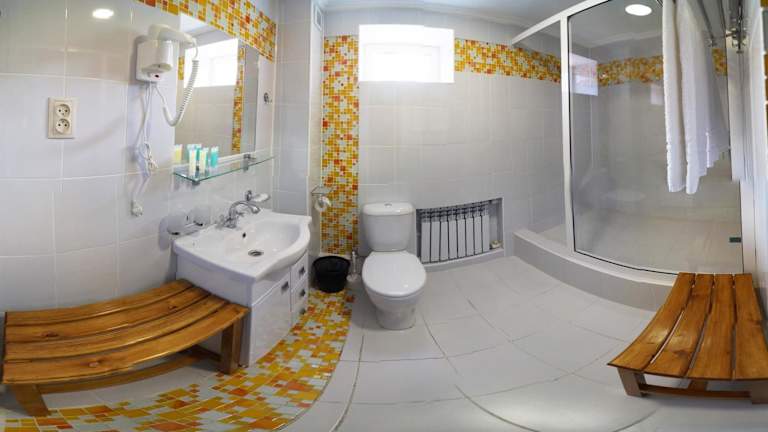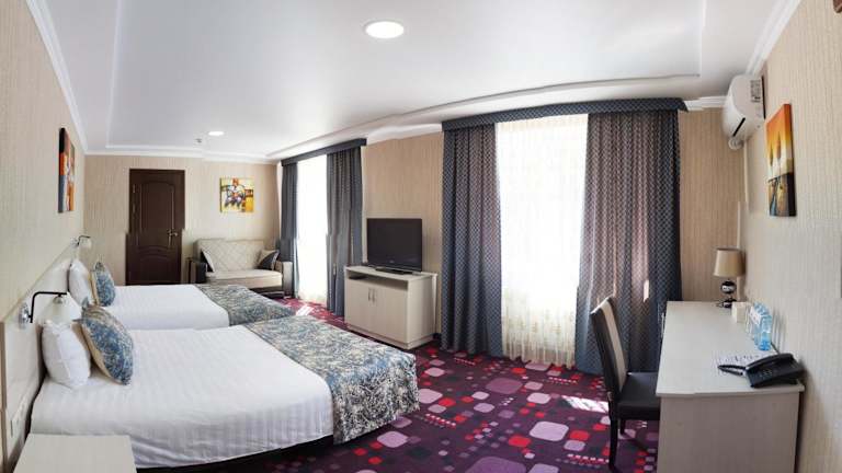 Die Zimmer im Uyut Hotel sind komfortabel und modern eingerichtet. Jedes Zimmer verfügt über eine Klimaanlage, die eine angenehme Temperatur während Ihres Aufenthalts gewährleistet. Sie können sich auf einen entspannten Abend vor dem Flachbild-Sat-TV freuen. Das eigene Bad ist mit einer Badewanne oder Dusche ausgestattet und es stehen Hausschuhe und kostenlose Pflegeprodukte für Sie bereit.