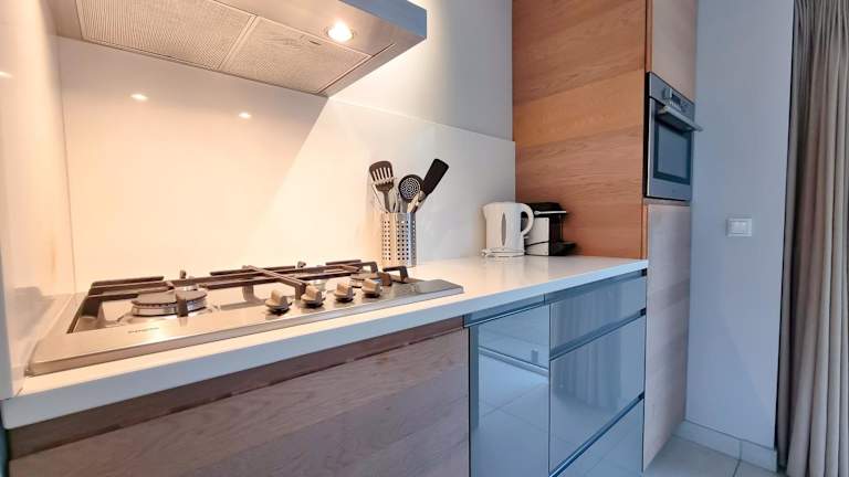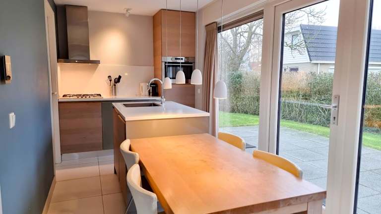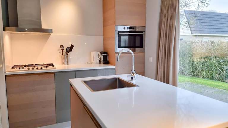 Die Küche des Ferienhauses ist mit einem Geschirrspüler, einem Ofen und einer Kaffeemaschine ausgestattet. Weitere Verpflegungsmöglichkeiten sind nicht angegeben.