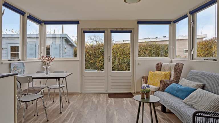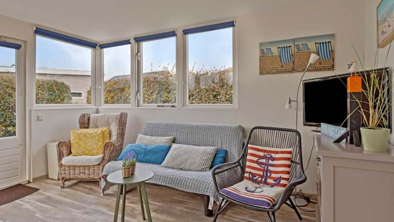 Das Ferienhaus bietet eine Terrasse mit Gartenblick, ein gut ausgestattetes Wohnzimmer, eine Küche mit Kühlschrank und Herdplatte sowie ein Badezimmer mit Dusche. Die Unterkunft ist für Erwachsene ab 18 Jahren vorgesehen und Haustiere sind nicht gestattet.