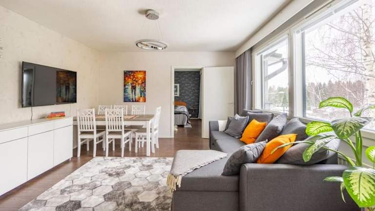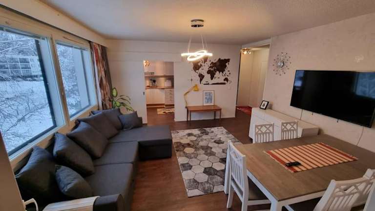 Das klimatisierte Apartment im Valoisa huoneisto jossa erinomaiset vuoteet verfügt über 2 gemütliche Schlafzimmer, ein geräumiges Wohnzimmer und eine voll ausgestattete Küche. Die moderne Einrichtung und die großen Fenster sorgen für eine helle und einladende Atmosphäre. Die Betten sind von erstklassiger Qualität und garantieren einen erholsamen Schlaf. Das Apartment bietet auch ein modernes Badezimmer mit einem Bidet und einer Dusche. Handtücher und Bettwäsche werden gestellt, um Ihren Aufenthalt so angenehm wie möglich zu gestalten.
