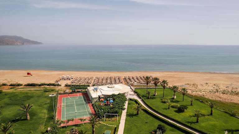 Das Hotel Vantaris Palace liegt direkt am Sand-/Kiesstrand Georgioupolis, etwa 3,5 km vom Ort Georgioupolis entfernt. Die Umgebung bietet eine schöne Gartenanlage, und die nächstgelegene Stadt ist Georgioupolis village, die in kurzer Distanz zu erreichen ist. Der Strand bietet sanft abfallendes Wasser und ist bekannt für seinen feinen Sand. Zudem ist der Kournas-See ca. 4 km entfernt, was eine kurze Fahrzeit von etwa 15 Minuten bedeutet. Der Flughafen Heraklion ist ungefähr 100 km entfernt, was eine Fahrzeit von etwa 1,5 Stunden bedeutet. Der Flughafen Chania befindet sich 51 km entfernt.