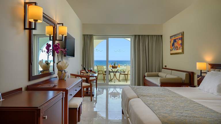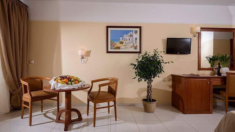Die Zimmer im Vantaris Palace sind vielfältig gestaltet und bieten unterschiedliche Ausblicke wie Meerblick, seitlichen Meerblick und Gartenaussicht. Die Zimmer sind komfortabel und funktional, ausgestattet mit Klimaanlage, Kühlschrank, Fernseher und WLAN ohne Gebühr. Ein Balkon oder eine Terrasse mit Sitzgelegenheit ist ebenfalls vorhanden. Zimmergrößen variieren von ca. 23 m² bis 34 m² und beinhalten Doppelzimmer sowie Familienzimmer mit separaten Bereichen. Die letzte Teilrenovierung erfolgte im Jahr 2019.