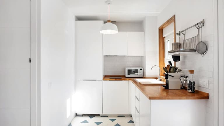 Die Küche der Ferienwohnung ist mit einem Kühlschrank, einer Mikrowelle, einer Herdplatte, einer Kaffeemaschine und einem Wasserkocher ausgestattet.