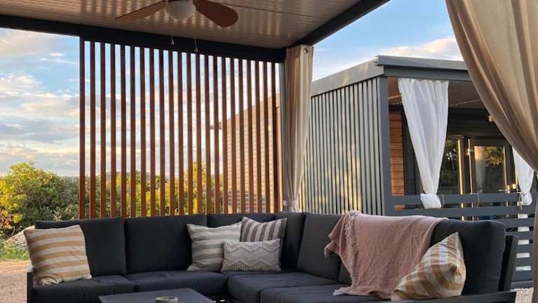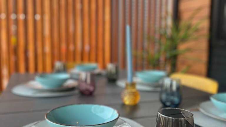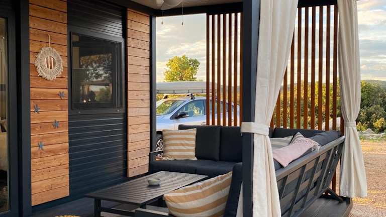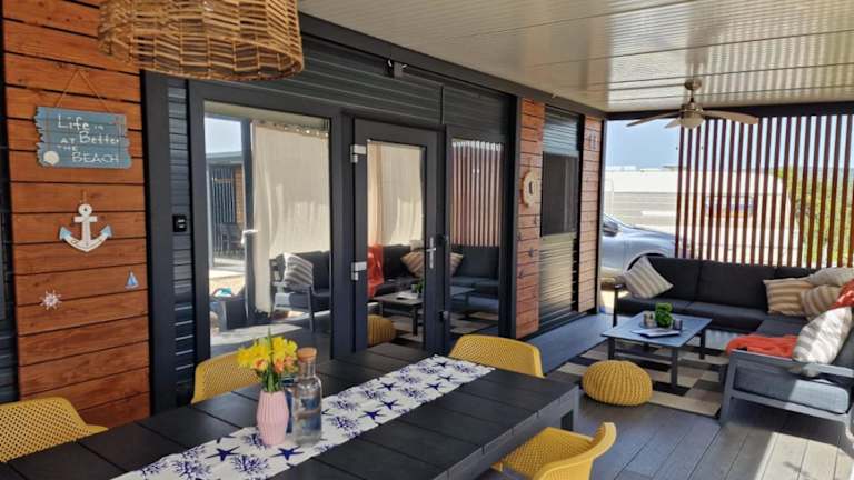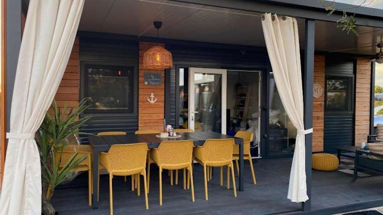 Die mobile Unterkunft umfasst zwei Schlafzimmer, ein Wohnzimmer und eine vollständig ausgestattete Küche mit Kühlschrank und Kaffeemaschine. Ein Badezimmer mit Dusche und Haartrockner ist ebenfalls vorhanden. Die Ausstattung umfasst auch Klimaanlage, Handtücher und Bettwäsche.