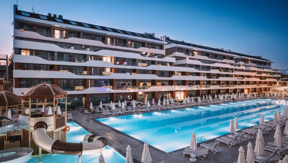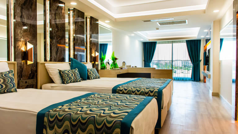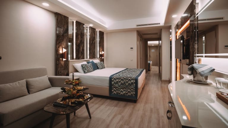 Liebe Gaeste, in allen Zimmern ist der Safe gegen einen Aufpreis. Sämtliche Zimmer verfügen über einen Balkon, Parkettboden, einer elektronischen Türkarte, Sofa und Sessel, Minibar, Wasserkocher, Tee/Kaffee Setups, nationales und internationales Satelliten-TV mit Tee- und Kaffeekocher, Direktwahltelefon, speziellen Toilettenartikel, Haartrockner, WC, Dusche , Bad-Telefon, zentrale Klimaanlage (wetterabhängig, stündlich), elektronischen Safe. Die Zimmerreinigung sowie der Wechsel von Handtüchern erfolgt täglich und der Wäschewechsel alle drei Tage. Bademäntel sind auf Anfrage gegen Gebühren erhältlich. Auf Wunsch kann ein Babybett im Zimmer platziert werden. Alle Zimmer sind Nichtraucherzimmer. Standardzimmer: Diese sind mit einer Größe von 28-32 m² modern eingerichtet. Die Mindestkapazität beträgt 2 und die maximale Kapazität 2+1 oder 3 Personen. Economy-Zimmer: Diese sind mit einer Größe von 28 m² modern eingerichtet. Sie befindet sich im Gartengeschoss und bieten Garten- sowie Poolblick. Die Mindestkapazität beträgt 2 und die maximale Kapazität 2+1 oder 3 Personen Standard behinderten-gerechte Zimmer: Unsere behindertengerechten Zimmer haben eine Größe von 32 m2 und sind für Übernachtungen von mindestens 1 sowie maximal 2+1 Personen geeignet. Terrassen Luxury Zimmer: Unsere Zimmer mit einem Nutzungsbereich von 43m² haben eine Größe von 28 m² und besitzen eine 15m² große Terrasse und sind modern eingerichtet. In diesen Zimmern befinden sich Espresso-/Kaffeemaschinen mit speziellen Kapseln. Die Mindestkapazität beträgt 2 und die maximale Kapazität 2+1 oder 3 Personen Terrassen Premium Zimmer: Unsere Zimmer mit einem Nutzungsbereich von 43m² haben eine Größe von 28 m² und besitzen eine 15m² große Terrasse, sind modern eingerichtet und haben einen Whirlpool auf der Terrasse. In diesen Zimmern befinden sich Espresso-/Kaffeemaschinen mit speziellen Kapseln. Es steht Ihnen in diesen Zimmern auch ein kostenfreier Bademantelservice zur Verfügung. Die Mindestkapazität beträgt 2 und die maximale Kapazität 2+1 oder 3 Personen Standard Deluxe Zimmer: Diese Zimmer mit einer Wohnfläche von 42 m² sind modern ausgestattet. Es befinden sich sowohl im Schlaf- als auch im Wohnbereich insgesamt 2 Fernseher. In diesen Zimmern befinden sich Espresso-/Kaffeemaschinen mit speziellen Kapseln. Die Mindestkapazität beträgt 2 und die maximale Kapazität 2+1 oder 3 Personen. Superior Familienzimmer: Das Superior Familienzimmer hat eine Größe von 42m² und bestehen aus 2 Schlafzimmern. Das Elternschlafzimmer hat ein französisches Bett, das zweite Schlafzimmer ein Twin Bett und es ist eine Verbindungstür vorhanden. Die wichtigste Eigenschaft dieses Zimmers ist die Dusch- und WC-Ausstattung: Es sind 2 Bäder vorhanden. Mit dieser Eigenschaft wird der Zeitverlust reduziert und die Familien haben mehr Zeit für Spaß im Urlaub. Die Mindestkapazität beträgt 2+1 und die maximale Kapazität 4+1 Personen. Familienzimmer: Dieses hat eine Größe von 35 m² und besteht aus 2 Schlafzimmern. Das Elternschlafzimmer hat ein französisches Bett, das zweite Schlafzimmer ein Twin Bett und es ist eine Verbindungstür vorhanden. Es ist ein Bad mit Dusche und WC vorhanden. Die Mindestkapazität beträgt 2+1 und die maximale Kapazität 4 Personen King Suite: Die King Suite besitzt mit einem 90 m² großen Schlafzimmer und einem Wohnzimmer sowie einer 50 m² großen Terrasse eine Gesamtnutzfläche von 140 m². Das Hauptschlafzimmer hat ein französisches Bett sowie ein Bad mit Duschkabine; das zweite Zimmer hingegen besteht aus einem luxurösen Wohnzimmer sowie einer Küche. In diesen Zimmern befinden sich Espresso-/Kaffeemaschinen mit speziellen Kapseln. Auch steht Ihnen in diesen Zimmern ein kostenfreier Bademantelservice zur Verfügung. Die Minimumkapazität beträgt 2+2 und die maximale Kapazität 4 Personen. Flitterwochenkonzept: Für unser Flitterwochengäste bieten wir eine spezielle Raumdekoration Bademäntel und Hotelslipper, eine reiche Auswahl an Annehmlichkeiten-Artikeln, Frühstück auf das Zimmer am ersten Tag sowie eine symbolische Torte in Herzform beim Check-in Geburtstagskonzept: Unseren Geburtstagsgästen wird bei Mitteilung an die Rezeption eine kostenfreie Geburtstagstorte und Wein zum Abendessen oder auf das Zimmer serviert. Hochzeitstag-Konzept: Für unsere Gäste, die Ihren Hochzeitstag bei uns verbringen, servieren wir eine Torte in Herzform sowie Wein.