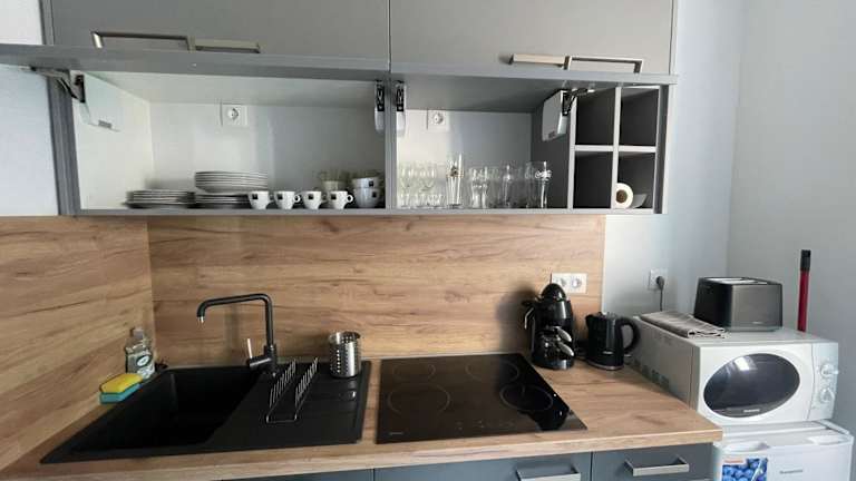 Das klimatisierte Apartment im Hotel Viczentrum verfügt über ein gemütliches Schlafzimmer und ein geräumiges Wohnzimmer mit einem Flachbild-TV. Eine voll ausgestattete Küche ist ebenfalls vorhanden, so dass Sie Ihre eigenen Mahlzeiten zubereiten können. Kostenloses WLAN und Privatparkplätze gehören zu den Annehmlichkeiten der Unterkunft.