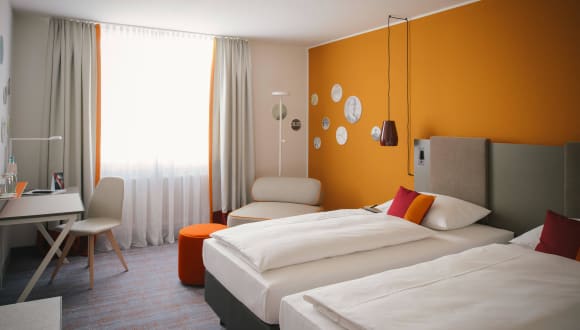 Frisches Blau, lebendiges Orange und spritziges Gelb-Grün: so erstrahlen die neuen Easy Zimmer. Kombiniert mit lässigen Möbeln, lokalen Dekorationselementen und kuschlig, bequemen Boxspringbetten sind die Zimmer perfekt für Ihren nächsten Aufenthalt. Kostenfreies Highspeed WLAN, digitale Zeitungen und eine Flasche Wasser runden das Angebot ab.