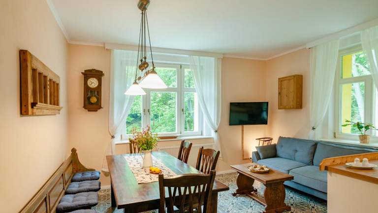 In der Villa Weigend können Sie sich im Miniclub vergnügen und den Gemeinschaftsgarten genießen. Eine Gemeinschaftslounge lädt zum Entspannen ein. In der Umgebung gibt es viele Möglichkeiten für Outdoor-Aktivitäten wie Wandern, Radfahren und Klettern. Die Festung Königstein und der Nationalpark Sächsische Schweiz sind beliebte Ausflugsziele, die Sie erkunden können.