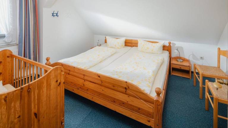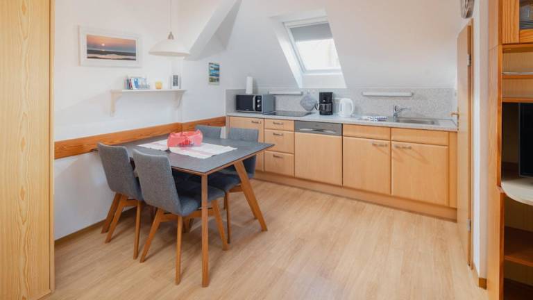 Die Ferienwohnung verfügt über ein Schlafzimmer, eine Küche mit Kühlschrank und Geschirrspüler, sowie ein Badezimmer mit Dusche, Haartrockner und Waschmaschine. Handtücher und Bettwäsche werden bereitgestellt.