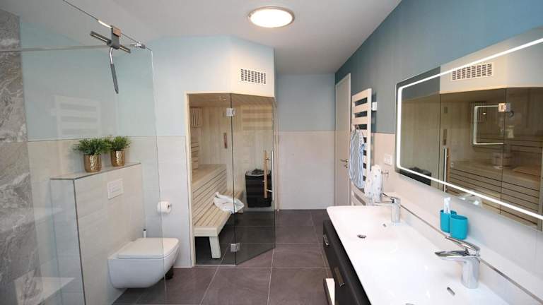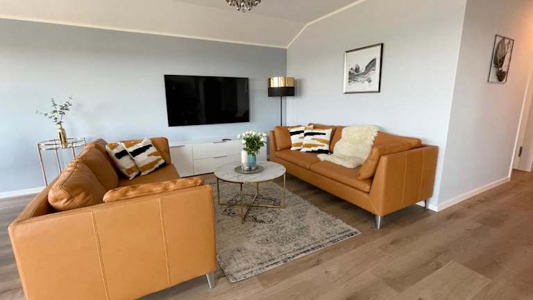 Die Ferienwohnung besteht aus 3 Schlafzimmern, einem Wohnzimmer und einer voll ausgestatteten Küche. Zur Ausstattung gehören ein Kühlschrank, eine Kaffeemaschine sowie 2 Badezimmer mit Dusche und Haartrockner. Handtücher und Bettwäsche werden bereitgestellt.