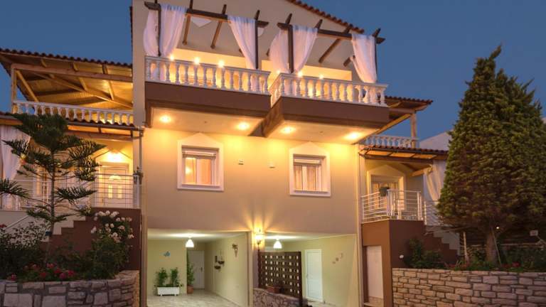 Die Villa Apollon erstreckt sich über 2 Ebenen und bietet einen geschmackvoll gestalteten Innenraum in warmen Farbtönen. Mit 3 Schlafzimmern und 2 Badezimmern bietet die Villa ausreichend Platz für bis zu 6 Personen. Im Wohnzimmer finden Sie einen TV mit CD-/DVD-Player für Ihre Unterhaltung. Die gut ausgestattete Küche verfügt über einen Kühlschrank, ein Kochfeld und eine Mikrowelle. Ein Essbereich ist ebenfalls vorhanden, um Ihre Mahlzeiten in gemütlicher Atmosphäre einzunehmen.