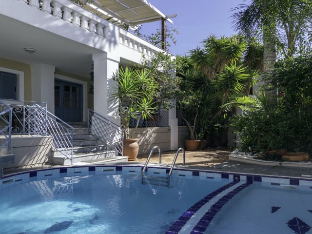 Die Villa Athena ist ein komfortables dreigeschossiges Ferienhaus mit 6 klimatisierten Schlafzimmern im Dorf Loutra. Zu jedem Schlafzimmer gehört ein Badezimmer und ein Kühlschrank. Zu 4 der 6 Schlafzimmer gehört außerdem jeweils ein kleines Wohnzimmer mit Küchen-Set. Das repräsentative Anwesen ist zwischen Bäumen und Blumen eingebettet. Im Erdgeschoss befindet sich der Wohnbereich mit Kamin, Essplatz und Open-Plan-Küche, ferner ein Badezimmer mit Badewanne und Waschmaschine. Vor dem Haus gibt es einen Swimmingpool. Die Villa verfügt über 6 klimatisierte Schlafzimmer, davon 2 im Erdgeschoss und 4 in den oberen Stockwerken, teilweise mit Innentreppen zu den Räumen im 2. Stock. Die Terrasse im Erdgeschoss und die Veranda im ersten Obergeschoss sind möbliert und mit Wein bzw. einer Blumen-Pergola überrankt. Auf der Dachterrasse gibt es ebenfalls Blumen sowie eine Pergola und Sonnenschirme. Von hier oben hat man einen herrlichen Blick auf die umliegenden Hügel und auf die Bucht von Rethymnon. Als Besonderheit verfügt das Haus über einen Konzertflügel. Der Wohnbereich im Erdgeschoss verfügt über Satelliten-Fernsehen, Klimaanlage und Kamin. Jedes der sechs Schlafzimmer ist in einem eigenen Stil gehalten und verfügt über eine separate Klimaanlage. Die meisten Schlafzimmer haben außerdem Fernsehgeräte (terrestrischer Empfang). Zu jedem Schlafzimmer gehört ein eigenes Bad mit Dusche und WC. Im Erdgeschoss gibt es ein siebtes Badezimmer mit Badewanne und Waschmaschine. Zu vier der sechs Schlafzimmer gehört außerdem jeweils ein eigener kleiner Wohnbereich mit Küchen-Set und Kühlschrank. Die anderen beiden Schlafzimmer haben ebenfalls Kühlschränke. Wöchentlich Wechsel von Bettwäsche und Handtüchern, Reinigung der Räume 2-mal pro Woche. Das Haus verfügt über Zentralheizung. Babybetten werden auf Wunsch bereitgestellt. Die Küchen-Sets in den vier kleinen Wohnzimmern sind mit allen erforderlichen Töpfen, Pfannen, Geschirr und Besteck sowie Kühlschränken ausgerüstet. Die große Küche im Erdgeschoss verfügt darüber hinaus über E-Herd mit Backofen und Dunstabzugshaube.